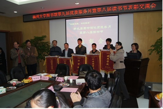 然后,汤德平馆长宣读表彰决定。本届优质服务月评出生均借阅册数排名前十的优秀学院,其中建筑学院生均借阅册数达24册,名列第一;评出年借阅量排名前十的优秀读者,其中学院张佳瑜读者年借阅量达到226册;评出王学贵同学等15名图书馆优秀学生馆员,评出何灿灿等25名优秀义务馆员。在“映像图书馆”摄影活动中征集到作品70幅,评出一、二、三等奖优秀作品八幅;在“书香文化”创意设计活动中征集到作品38幅,评出一、二、三等奖优秀作品八幅。并给“图书借阅量优胜学院”代表颁发了锦旗,给“图书借阅量优胜个人”、“优秀学生馆员”和“优秀义务馆员”颁发了证书与笔记本,给“映像图书馆”摄影比赛和“书香文化”创意设计作品征集比赛的获奖者颁发了证书与奖金。