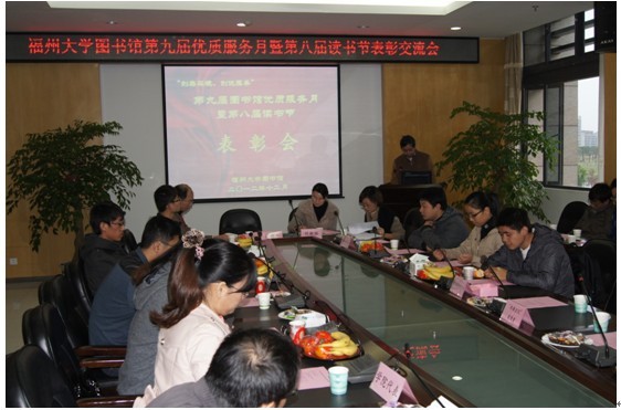 2012年12月13日下午,我馆“第九届优质服务宣传月暨第八届读书节”表彰交流会在图书馆二楼206会议室举行。我馆汤德平馆长、刘敏榕书记、林熙阳副馆长、各部门主任及所有获奖的学院代表及获奖读者参加了这次表彰交流会。