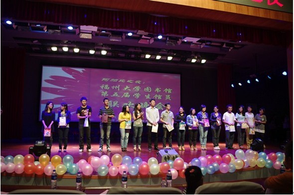 2012年10月27日晚,福州大学图书馆第五届学生馆员联欢晚会在图书馆博学厅盛大开幕,本次晚会邀请了图书馆各位老师以及曾对图书馆工作做出过贡献的已毕业学生参加。怀抱着对图书馆工作的一腔热忱,馆员们在短短两周时间内,齐心协力,准备了这一场精彩的晚会。