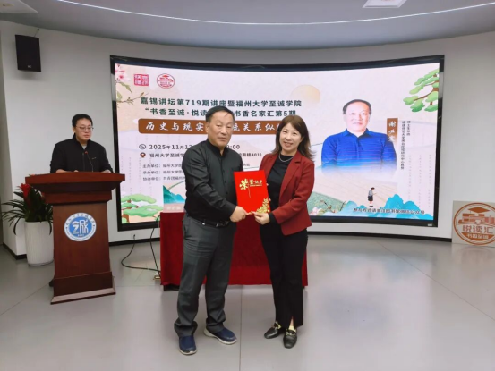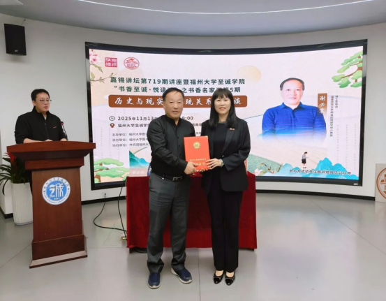 讲座现场,福州大学图书馆馆长林林为谢必震教授颁发嘉锡讲坛荣誉证书,至诚学院党委常务副书记何小红为其颁发书香至诚·悦读汇之书香名家汇主讲嘉宾证书,并对谢教授的精彩分享表示衷心感谢。