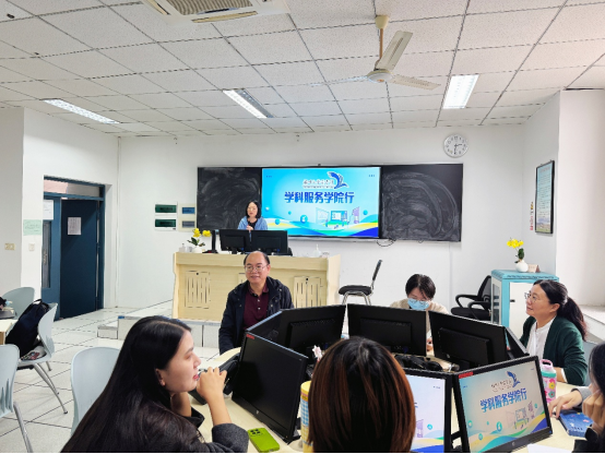座谈会在外国语学院多媒体教研室召开。林熙阳副馆长详细介绍了图书馆的核心服务体系,涵盖教研支持、知识普惠、信息服务与阅读推广四大板块,同时说明图书馆在电子资源采购与纸质书刊馆藏建设方面的相关安排。他重点推介了福建省高校数字图书馆(FULink)的各项优质信息服务,指导教师们更便捷获取学术资源。