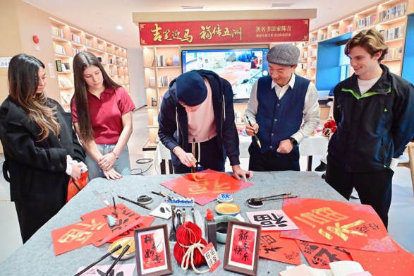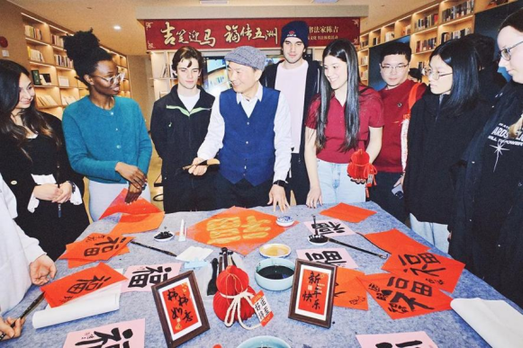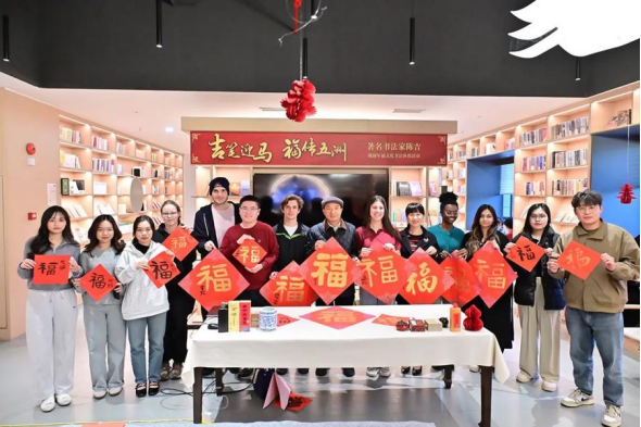 在互动环节中,陈吉老师现场示范创作,师生凝神运笔,一个个饱满圆融的“福”字跃然纸上。来自德国,美国,越南,老挝,巴西等多个国家的留学生也握笔体验,在横竖撇捺间感受汉字的结构之美与祝福之温。一名海外学子感慨:“每一笔都像在对话历史,每一个‘福’字都承载着跨越语言的文化温度。”