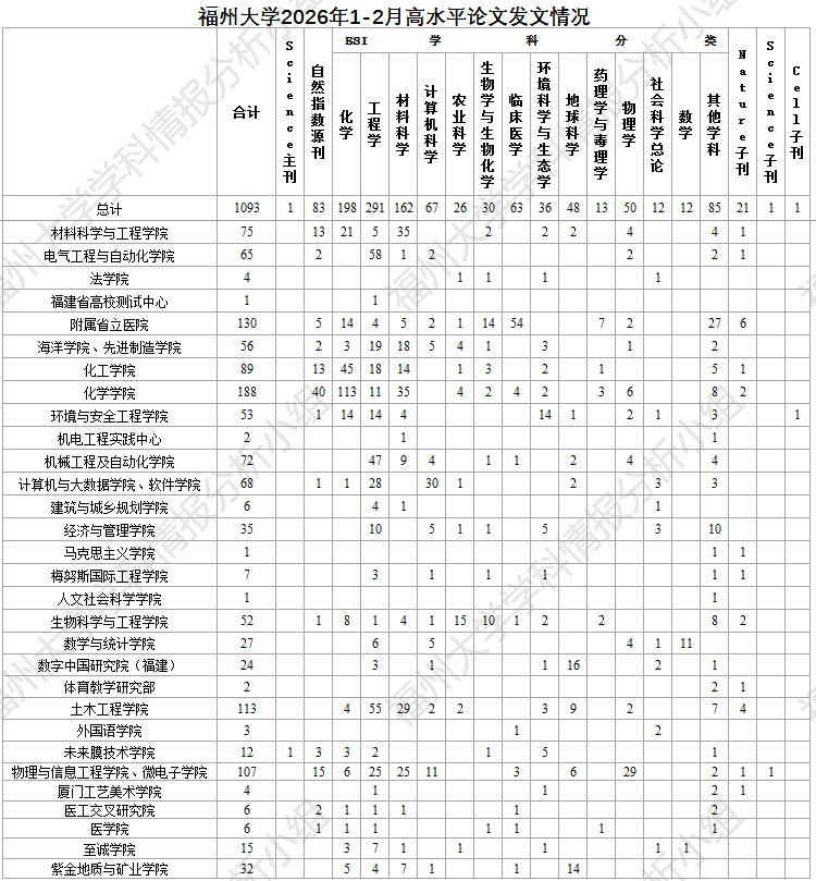 为了方便我校教学科研、科研管理等相关人员及时了解、跟踪本校高水平论文的收录情况,福州大学图书馆学科情报分析小组利用WoS数据库对近期作者单位为“福州大学”的论文进行了收集整理统计,更新时间为2025年2月28日。