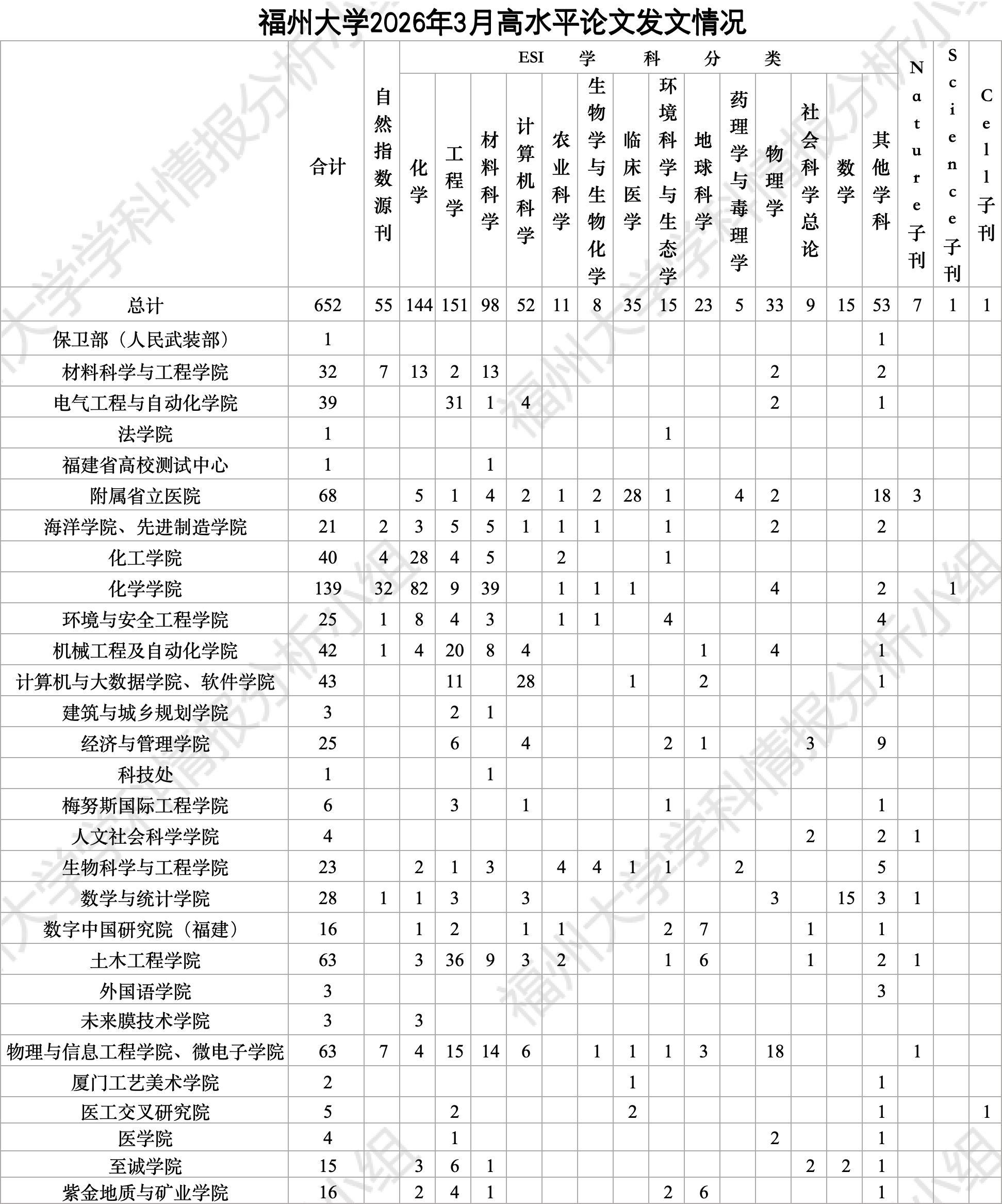 为了方便我校教学科研、科研管理等相关人员及时了解、跟踪本校高水平论文的收录情况,福州大学图书馆学科情报分析小组利用WoS数据库对近期作者单位为“福州大学”的论文进行了收集整理统计,更新时间为2026年3月31日。